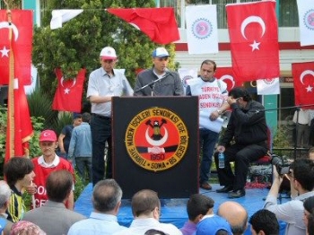 Soma'daki 1 Mayıs kutlamalarında sendikamız Ege Bölgesi Şubesi Başkanı Tamer Küçükgençay bir konuşma yaptı. Konuşmasında Soma'nın ülkenin en önemli kömür havzalarından birisi olduğunu belirten Küçükgençay Şehrimiz bu kömür havzası üzerindeki kurulu kömür işletmesi ve termik santrali ile ülkemiz için önemli bir enerji üssü konumundadır. Şunu asla unutmamalıyız ki; Soma'nın bugünkü durumuna gelmesi, ekonomik potansiyelin yüksek olması bu şehirde ülkenin her yöresinden insanların bulunması, tesadüflerin değil, kömür ve kömüre dayalı çalışan termik santral gerçeğinin bir sonucudur dedi