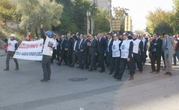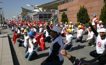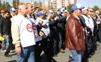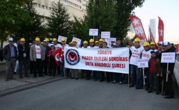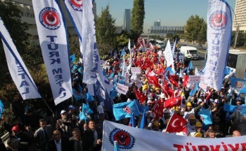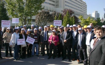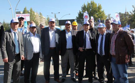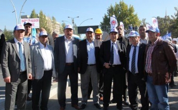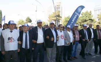 Sayıştay binası önünde Sendikamız Genel Başkanı Nurettin Akçul ve yönetim kurulu tarafından karşılanan, maden ve enerji işçileri otobüslerinden indikten sonra onları bekleyen korteje katılarak yürürüşe başladılar.