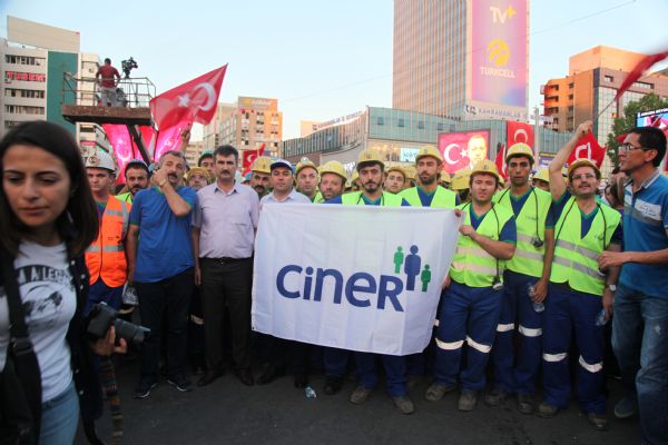 Türk-İş’e bağlı sendika başkan ve yönetimleri, işçiler ve halk Türk-İş Genel Merkezi önünde toplandı. Hain darbe girişimi sırasında hayatını kaybeden şehitler için 1 dakikalık saygı duruşunda bulunuldu ve İstiklal Marşı okundu. Türk-İş Genel Başkanı Ergün Atalay burada yaptığı konuşmada şunları söyledi: