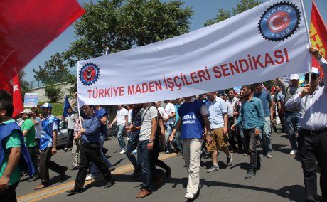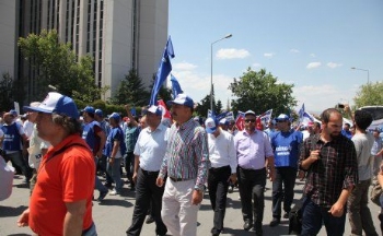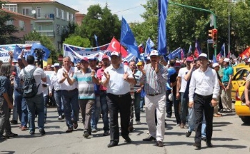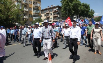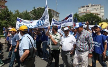 Grev hakkı Bakanlar Kurulu tarafından ertelenen Kristal-İş üyesi Şişecam işçileri, Ankara'da bir araya gelip Çalışma Bakanlığı'na yürüdü.