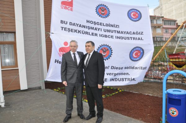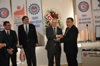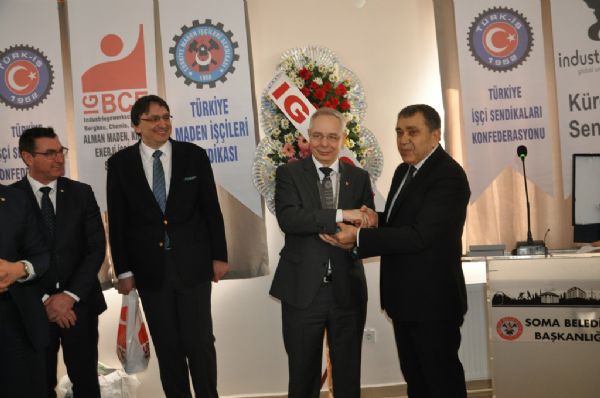 Programın açılış konuşmasını yapan sendikamız Genel Başkanı Nurettin Akçul, İG-BCE Sendikasının Almanya’da bulunan kardeş sendikaları olduğunu belirterek, "Avrupa’da bu sendikamızın 6 milyonun üzerinde üyesi bulunuyor. Zor zamanımızda hep yanımızda oldular. İG-BCE Başkanımız maden faciasını yaşadığımızda ilk arayanlardan birisidir. Her zaman bizim yanımızda oldular. 13 Mayıs’ta dünyayı ayağa kaldıran bir facia yaşandı. 301 canımızı kaybettik. Üzerimizden adeta silindir geçti. Soma, Kınık, Kırkağaç’ın üzerinden geçti. O süreçte dostlarımızı gördük. Fırsatçıları da gördük. Arkadaşlarımızın sağduyusu ile bu süreci atlattık. Görülmeyen kahramanlar da vardı. Hakkı Bey, Belediye Başkanımız, Kaymakamımız facianın zararlarının en aza indirilmesi için ellerinden geleni yaptılar. Bugünlere böyle gelindi. 13 Mayıs sonrası IG-BCE sendikamız kampanya düzenledi. Toplanan para ile kardeşlerimiz buraya gönlünü bıraktı. Şehit ailelerinin yakınlarına katkı sunmak ve madenci kardeşlerimize eğitim amaçlı bir yatırım yapıldı" dedi.