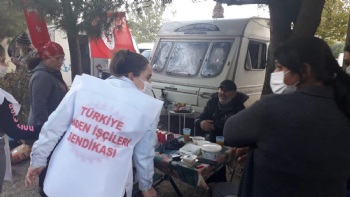 İzmir misafirhanesinde görev yapan sendikamız kadın çalışanları, Servet Akçul, Nurten Kul, Türkan Uzun ve Gülşah İnal , depremzedelere büyük bir öz veriyle hizmet vermeye devam ediyor. Ulusal basının da dikkatini çeken yardım çadırımızda görev alan misafirhanemiz resepsiyon çalışanı Servet Akçul 'Biz deprem günü iş yerimizdeydik. Depremzedelere nasıl yardımcı olabiliriz diye düşünürken,sendikamız yardım çadırı kurdu ve stant açtı. Çoluk çocuk demeden buraya geldik ve elimizden geldiği kadar yardımcı olmaya çalışıyoruz' dedi.