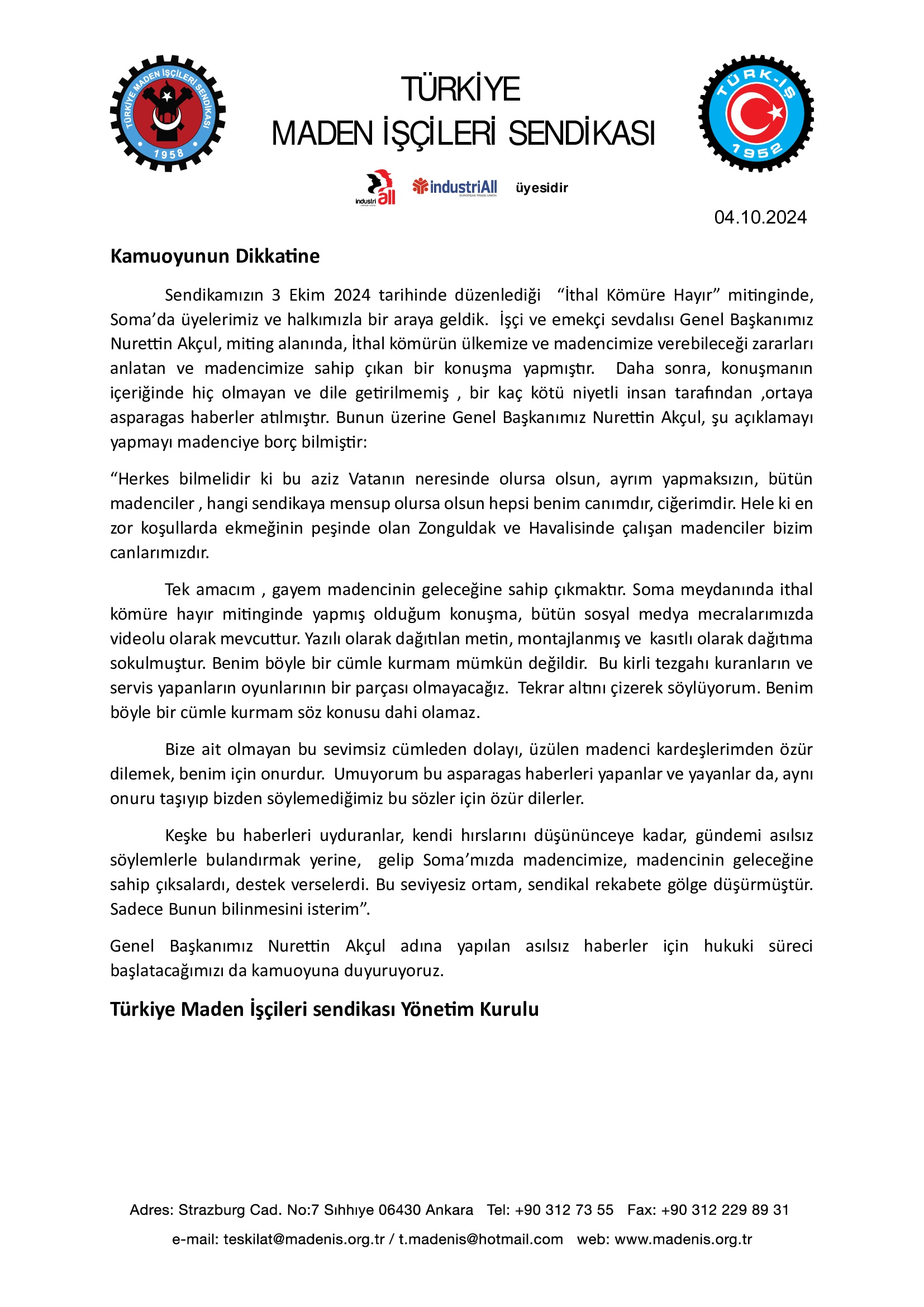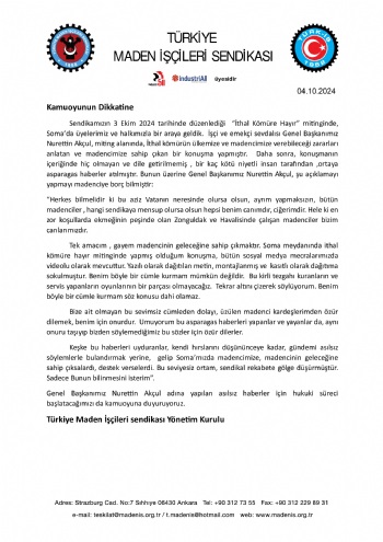Sendikamızın 3 Ekim 2024 tarihinde düzenlediği 'İthal Kömüre Hayır' mitinginde, Soma'da üyelerimiz ve halkımızla bir araya geldik. İşçi ve emekçi sevdalısı Genel Başkanımız Nurettin Akçul, miting alanında, İthal kömürün ülkemize ve madencimize verebileceği zararları anlatan ve madencimize sahip çıkan bir konuşma yapmıştır. Daha sonra, konuşmanın içeriğinde hiç olmayan ve dile getirilmemiş , bir kaç kötü niyetli insan tarafından ,ortaya asparagas haberler atılmıştır. Bunun üzerine Genel Başkanımız Nurettin Akçul, şu açıklamayı yapmayı madenciye borç bilmiştir: