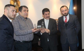 Milliyetçi Sanayici İş Adamları Derneğinin faaliyetleri bilgi veren Öncel, Başkanımız Akçul'a porselen tabak hediye ederken Akçul da Özel'e madenci heykeli hediye etti.