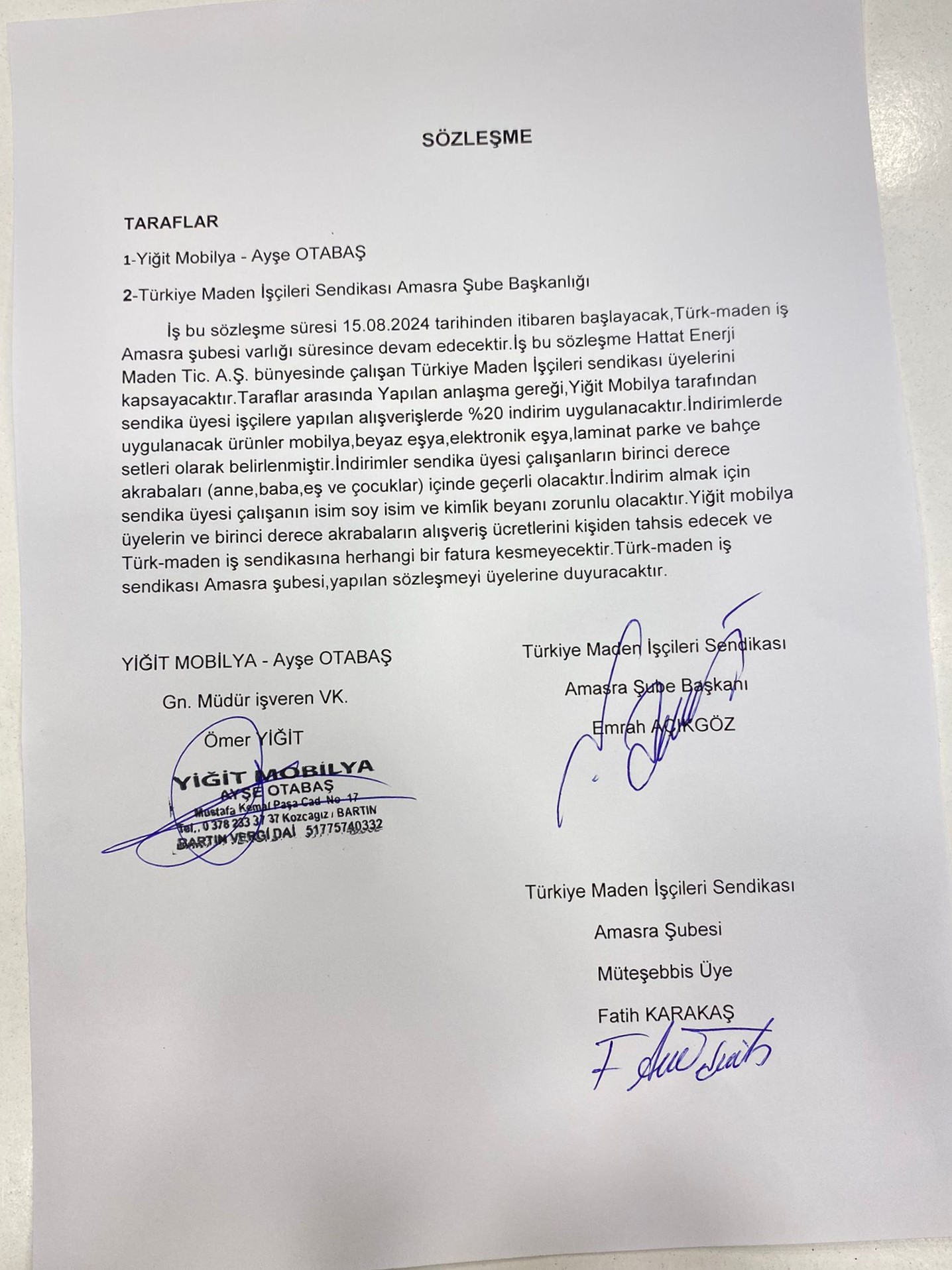 Yapılan sözleşmeye göre Hattat Enerji Maden Tic. A.Ş. bünyesinde çalışan üyelerimiz Yiğit Mobilyadan yüzde 20 indirim hakkına sahp olacak.