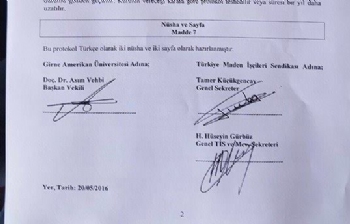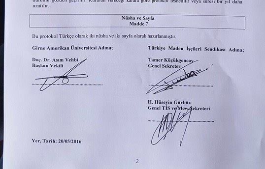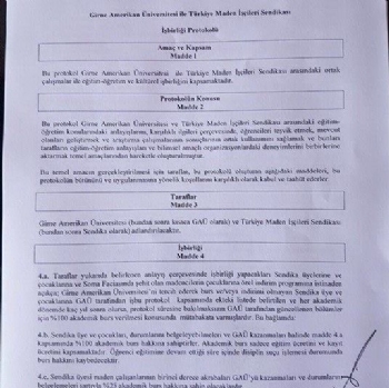 Sendikamız ile Kuzey Kıbrıs Türk Cumhuriyeti'nde bulunan Girne Amerikan Üniversitesi(GAÜ) arasında eğitim- öğretim ve kültürel işbirliği kapsamında protokol imzalandı. Protokole göre, belirlenen anlayış çerçevesinde sendikamız üyelerine ve çocuklarına, ayrıca Soma faciasında şehit olan madencilerin çocuklarına özel indirim ve burs sağlanacak.