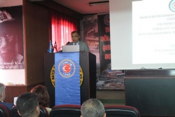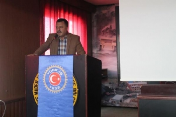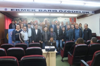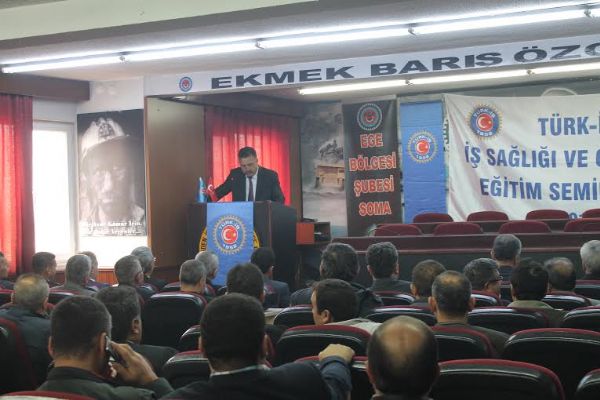 İki gün süren “İş Sağlığı ve Güvenliği” seminerinin açılış konuşmasını Sendikamız Genel Eğtm ve Araşt. Sekreteri Ahmet Çümen yaptı. Ahmet Çümen konuşmasında eğitim seminerinin amacı ve katkısından bahsederken şunları söyledi: “ Türk-İş Genel Merkezi ile birlikte bu seminerlerin ikincisini Soma’da yapıyoruz. Seminerlerin amacı sağlıklı olmak, işyerlerinde güvenilir bir şekilde çalışmak, ve olabilecek olayların önüne geçmek için ne gibi tedbirlerin alınması gerektiğini anlatmak. Bu seminerler hem bizi hem de işçilerimizi memnun ediyor. iki gün boyunca Somalı işçilerimizle olmaktan mutluluk duyuyoruz. Önce iş sağlığı güvenliği, sonra üretim düşüncemizi her yerde olduğu gibi burada da tekrarlıyorum. Seminerimiz üyemiz işçilere hayırlı olsun”.