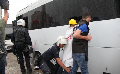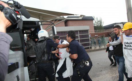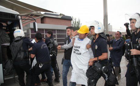 Açıklamanın ardından emniyet güçleri grubun dağılması yönünde uyarıda bulundu. Bakanlık önünde 1 saat oturma eylemi yapacaklarını belirten işçiler, polisin uyarısını dikkate almadı. Ekipler, gruba iki dakika süre verdi. Eylemcilerin dağılmaması üzerine Çevik Kuvvet ekipleri işçilerin etrafına sardı. Gruba biber gazıyla müdahalede bulundu.. Korkuluklara kendilerini zincirleyen işçilerin zincirleri demir kesme makasıyla kesildi. Bakanlık önünden ayrılmak istemeyen işçiler güçlükle gözaltına alındı. Polis aracına götürülen işçiler slogan atmayı sürdürdü. Gözaltına alınan 15 işçi karakola götürüldü.