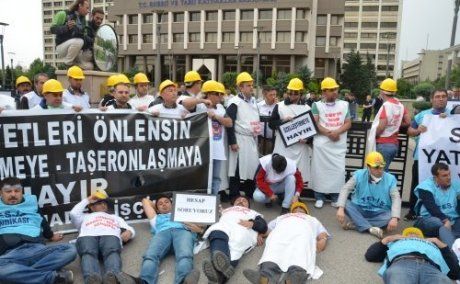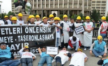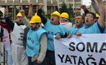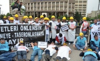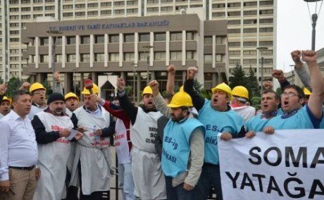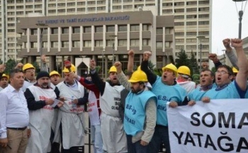 Kurtuluş Parkı'nda Özelleştirme İdaresi Başkanlığı'nın karşısında uzun süredir özelleştirme karşıtı eylem yapan sendikamız ve Tes-iş üyesi Yatağan işçileri öğle saatlerinde Enerji ve Tabi Kaynaklar Bakanlığı'na geldi. İşçiler burada kendilerine bakanlığın demir korkuluklarına zincirledi. -lsquo;Yatağan Soma olmayacak', -lsquo;İş cinayetleri önlensin, özelleştirmeye, taşeronlaşmaya hayır' döviz ve pankartları açtı. -lsquo;Soma'nın hesabı sorulacak' sloganları attı.