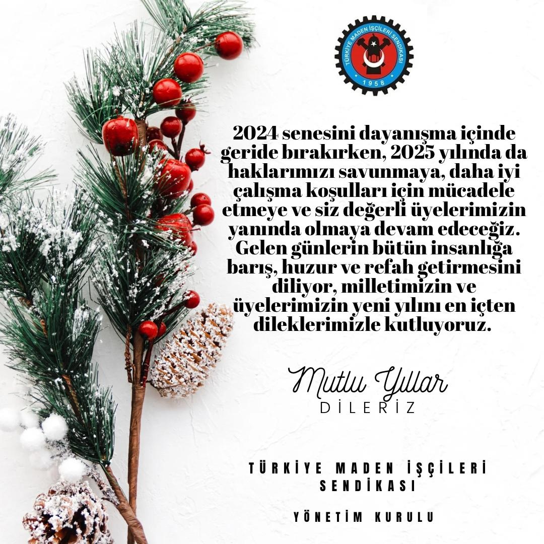 Madencilerimiz olmak üzere tüm emekçi kardeşlerimizin ve ailelerinin yeni yılını kutluyor, 2025 yılının sağlık, mutluluk, barış, huzur ve başarı getirmesini temenni ediyoruz. Birlik ve dayanışmanın gücüyle yeni yılda da omuz omuza olmaya devam edeceğiz.